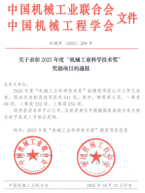 近日,2025年度“机械工业科学技术奖”获奖名单正式揭晓,实验室荣获1项特等奖、1项一等奖。