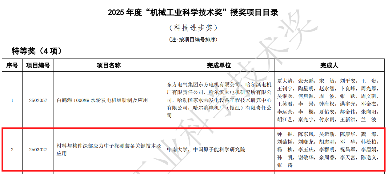 实验室钟掘院士牵头完成的“材料与构件深部应力中子探测装备关键技术及应用”荣获“机械工业科学技术奖”科技进步奖特等奖。